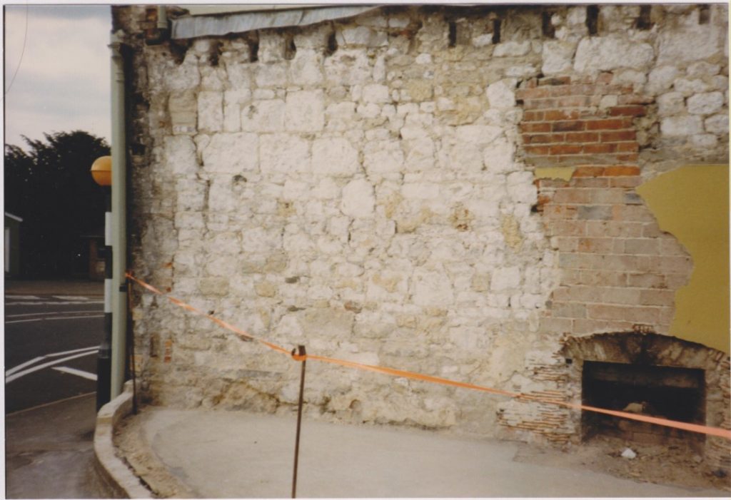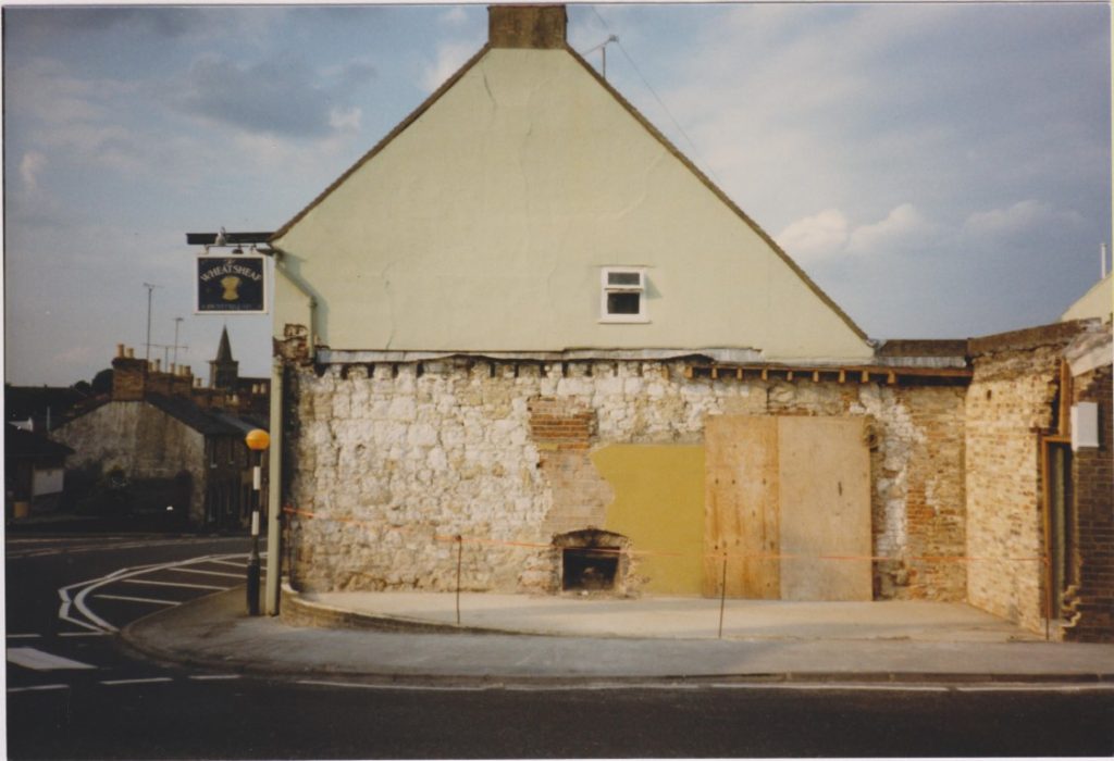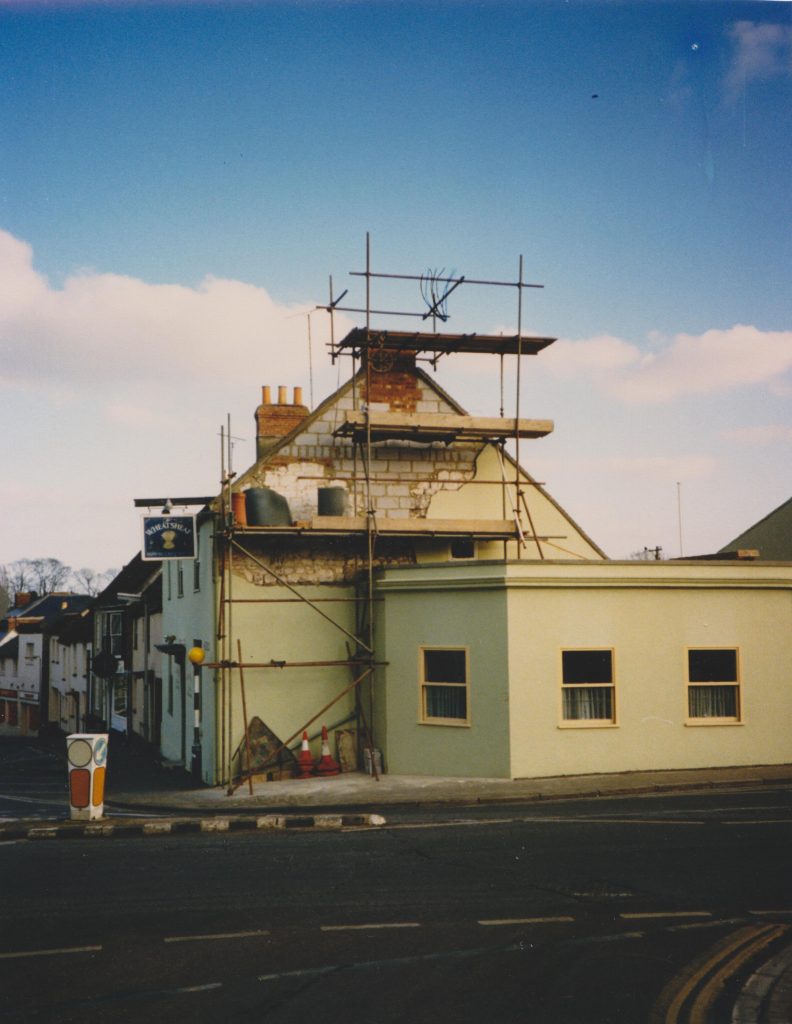 Photograph of The Wheatsheaf and corner of New Road after wall collapsed 1986. See also Catalogue numbers MP 076 & MP 077.
